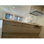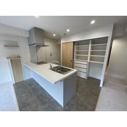 ペニンシュラ型キッチン キッチンと収納の間も広くなるよう移設 キッチン収納造作 ダウンライト新設