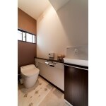 大人のアジアンカフェをイメージし、ブラウンを基調とした空間。 タンクレストイレなので節水効果があり、楽な姿勢で使える手洗いカウンターを設置しました。
