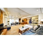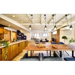 2階の広大なスペースは、元は剣舞場だったもの。 その広さをそのまま利用して、ゲストを大勢呼んでもゆとりのあるLDKに仕上げました。 LDKは間仕切りを設けずに開放的なつくりにし、キッチン・ダイニング・リビング・スキップフロアを自由に行き交うことができるように。 それぞれが思い思いに愉しめる、バカンス気分を味わうリラックス空間が生まれました。