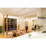 「玄関」という枠にとらわれず、限られたスペースを有効に使えるように、庭を新設したスロープからウッドデッキを通って、大型サッシから、ダイニングに設けたインナーテラスに直接入るという動線を計画。また、ダイニングを1階の中央に配置し、それぞれの個室の開口をなるべく広くとり、空間の開放感・つながりを演出した。また間接照明を多数取り入れ、テレビの背面にはエコカラットをあしらった。トイレは和の渋さにこだわりデザインした。