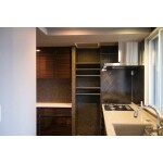 施工後のキッチンです。明るい色味のキッチンスペースからガラッとシックで高級感のある雰囲気に変わりました。奥には収納棚も設置し、使いやすく収納スペースも増えました。