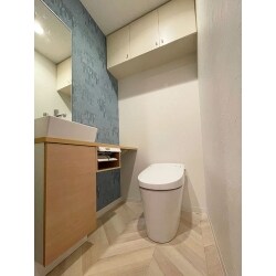 LIXIL サティスリトイレSタイプ SR6グレードにお取替え。 明るくスッキリとした手洗器「キャパシア」セミフロートキャビネットも設置しました。 大型パネルで配管類を隠してトイレ周りがスッキリします。 床は、サンゲツのクッションフロアをお選びいただきました。 ウッドの上品な色の変化と優しい節の表現が使いやすいフレンチヘリンボーン柄です。 アクセントクロスは、小説で描かれたアート壁紙をお選びいただきました。