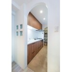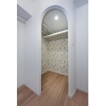 閉鎖的だったキッチンは、リビング・ダイニングにR開口で空間を繋ぎました。ダイニング側の壁に埋め込んだガラスブロックからほのかに光が入り、ご家族の気配を感じながら、料理を楽しむことができます。 ご要望頂いたパントリーは、ウォークインクローゼットの一部を取り込むことで実現させました。こちらもRの開口と花柄のクロスが華やかさをプラスします。