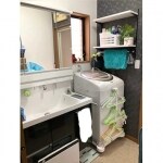 水撥ねを気にせずに済むエンドパネルを取付。 洗面台本体がW750からW900になっても、収納が減らないように洗濯機上の収納を新設 今後の浴室の工事も考えて、浴室面のクロスはアクセントにしました。 エンドパネル分間口を広げるために、洗濯機キャスターを取り付けました。