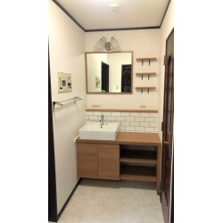 鏡やシェルフの位置などK様とヒアリング、打合せを重ねK様オリジナルのデザインや仕様をご提案させていただきました。 洗面は奥行きがコンパクトでどんな場所にでもなじむLIXIL様の「エスタ」をご提案させていただきました。 好みの洗面器、収納が選べますベッセルタイプとなっており、お手入れしやすいアクアセラミック素材を使用ですので日々のお手入れもラクにでき、収納も充実なプランとなっております。