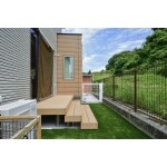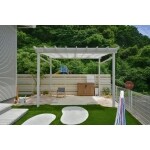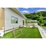 ワンちゃんのドックランとご家族で集まる空間の両方を広く取れるよう、憩いの場としてのテラスを敷地の角に設け、日差しを遮る独立式の屋根と、掃き出し窓の前にテラスへの階段とアプローチを設置。乱形自然石や木調樹脂とホワイトの屋根やフェンスで明るく可愛らしいお庭に。あざやかなグリーンの人工芝は雑草対策にもなります。ワンちゃんの足も洗える大型パンの水栓や、ホースを付けたままにできる補助蛇口、リードを掛けられるフックや収納倉庫など、機能性も抜群のお庭です。