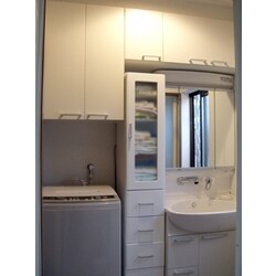 収納が増え、洗面脱衣所にこまごまとあった物がすっきりと片付きました。オーダー品だと、不自然になるかな、と少し心配したけど、洗面化粧台とクロスに合わせた素材で作ってもらったので違和感なく出来上がりました。小さい工事だけど、打ち合わせや仕様決めを念入りに出来たので満足しています。