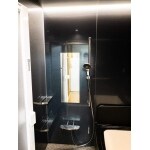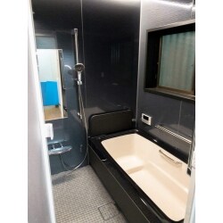 L社のスパージュを設置いたしました。 ブラックの浴槽とブルーのアクセントパネルで高級感のある浴室空間に仕上がっています。 正面上部のライトは調光調色システム付で気分によって明るさを調整できるようになっており、断熱性も製品自体の性能アップ&オプションでの保温材追加で快適に入浴できます。