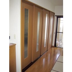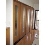 6帖和室とリビングを遮る間仕切り壁に圧迫感を感じておられました。6帖和室は、寝室として使用されているため、部屋を間仕切ながらも開放感を感じるものにされたいとのご要望でした。 間仕切り機能と明るさを兼ね備え、必要に応じて、4枚の建具を1枚分に納めることができる「4枚引戸」のご提案をさせていただきました。 開放感を引き出すために、建具に縦型ガラススリットを施し、採光も十分に確保することができました。また、建具の色を既存の床の色に合わせることによって、統一感を出しました。更に床のレベル差が激しかったため、鴨居に緩衝材を施すなどして、スムーズな開閉を実現しました。