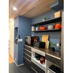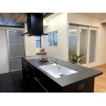 高級感のあるグラリオカウンターと、キッチンの床はラピスタイルフロアー。 抗菌仕様で水や汚れに強い素材でお手入れがとても簡単です。 左奥の扉はパントリーです。 要所要所でしまうことができる収納にして欲しいとご要望をいただいておりましたので、収納はたっぷりととらせていただきました。