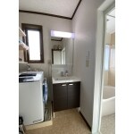 内装は問題なかった為、浴室入り口側のクロスのみ貼替させて頂き、洗面台を交換させて頂きました。 窓枠等と色味を合わせたソフトウォールナットの扉面材で、引き締まった印象に、スッキリと仕上りました。