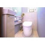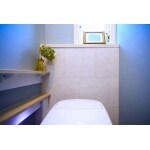奥様が丁寧に育てたお花が映えるトイレ空間になるよう意識しました。 床は、掃除のしやすいフロアタイルにしたことで表面がなめらかで、汚れがサッと取れるのも魅力的です。 アクセントとして”エコカラット”を貼りました。 こだわって選定した淡いブルーのクロスにより、背面のエコカラットを引き立てつつ、爽やかな印象のトイレ空間になりました。