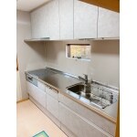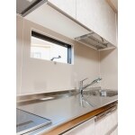 既存の窓に合わせて収納キャビネットを配置したキッチン