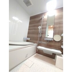 全体的に明るく、アクセントでウッド調のパネルを採用しシックで温かい浴室となりました。