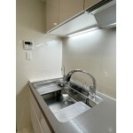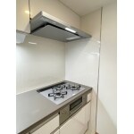 扉面材は光沢のある「グレイスフルホワイト」をお選び頂きました。 吊戸にはクイックポケットを設置。 引出しを開け閉めしなくても調味料などの出し入れができるので、調理のリズムをくずさず快適に調理できます。使い終わったらキャビネット下にすっきり収納。調理中の手元を照らすLED照明付タイプを設置しました。 壁はタイル貼からキッチンパネルに変更しました。乾拭きでも汚れが落とせる優れた清掃性により、コンロまわりの油ハネも、簡単に拭き取れます。色は「モイストベージュ」をお選び頂きました。
