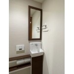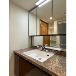 LIXIL ルミシス W1190にお取替え。 埋込収納は撤去し、鏡は収納できる三面鏡に変更しました。 扉の色はハイグレードの「アンティークブラウン」です。 高級感のある光沢のある面材と上品なカウンターで、美しいホテルのような洗面化粧台に生まれ変わりました。