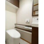 TOTO ネオレスト手洗器付 Sサイズ カウンタータイプにお取替え。トイレはRH1です。 トイレ背面にはトイレットペーパーやタオルなどが収納できる背面ウォール収納キャビネットを設置しました。