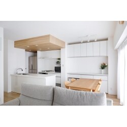 壁を撤去しオープンキッチンにしました。対面でありつつ、キッチンの横にダイニングテーブルもおける配置を考えた結果、流しとコンロが分かれた2列型キッチンを採用いたしました。ダイニング側の壁にも、キッチンと同じ扉材の壁面収納を作り、調理グッズや食器もすべて収められるようにしました。天井のふかし部分に、木目調のシートを貼りました。アクセントになるだけでなく、ゆるやかに空間を分ける役割もあります。木目シートはフローリングと合わせて長手方向に揃え、奥行きを感じるようにしました。扉の先は洗面室と浴室につながり、家事動線もスムーズです。