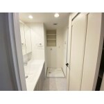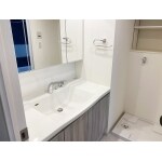 シンプルで機能的、グレージュが作り出す落ち着きのある洗面空間