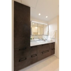 もともと洗面台カウンターにトールの収納がありました。 収納の部分はちょうど柱型がありました。既製品のままでは設置不可である為、収納部分のみ家具屋さんに加工してもらい設置しています。加工することで収納と化粧台の面材を揃えることができスッキリとカッコよく仕上がりました。マンション特注のサイズの化粧台でもご対応、ご提案させていただきます。予算はかかってしまうかもしれませんが柱や梁のサイズに合わせて造作家具やオーダータイプの家具だとピッタリサイズで仕上がるので見た目もスッキリでオススメです。