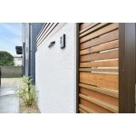 三協アルミ「フィオーレ」を使った門塀は、木目のフェンスがナチュラルな雰囲気に仕上がっています。アルミに木調のラッピングをしており、色むらのある木目の風合いが本物の木材のようですが、腐ったりせず経年変化もしにくい素材です。この門塀は玄関を開けた時の目線隠しにもなっており、裏側の自転車もおけるスペースや生活感を見せない工夫をしています。あえてポストは門塀には付けず、まるい笠木がとってもお洒落な宅配ポストと一体になったタイプを選びオリーブの鉢と玄関のアクセントになっています。