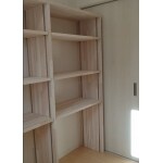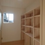 キッチン側からもトイレ・手洗い側からも部屋に入り回遊できるような間取りでご提案しました。集成材で造作棚を作り、可動式とすることで金額を抑え、自由度の高い収納をご提案しました。