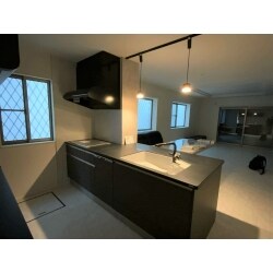 シンプルな雰囲気の壁紙ということで、白色でシンプルなものを提案いたしました。 さらに、光沢感のある床材にしたことで、シンプルすぎない高級感のあるリビングになりました。 またキッチンは、リビングのクロスとは対照的なブラックにしたことで、メリハリのあるシックモダンな空間に仕上げました。