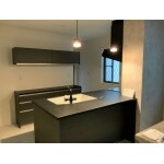 吊戸棚の変わりにダウンライトを取り付けたことで、キッチンの明るさを出しながら、対面キッチンの良さである、リビングを眺めることができるようになりました。