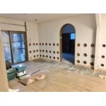 木質パネル工法のお宅ため、穴を開け水抜き作業を行いました。乾燥期間約3ヶ月。断熱材の交換をし、 新たな木質パネルへと生まれ変わりました。床下は防蟻処理、消毒を行っています。
