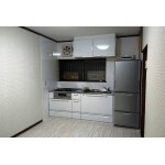 今の生活スタイルに合ったコンパクトなI型キッチンに。壁、天井のクロスの貼り替えと床の貼り替えもされ白を基調としたキッチンは明るく清潔感があります。