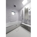 2世帯への全面改装に合わせて東側にあった浴室を西側へ大きく移設しました。 元々勾配天井があった浴室は圧迫感があり、脱衣所もスペースが狭く窮屈な印象でしたが間取り変更で水まわりをまとめたことによって、洗面室から広々とした脱衣所を通り浴室へと繋がる動線へと変更。 明るく開放感のある素敵な浴室へと生まれ変わりました。 足元に段差もなく手摺も取り付け、バリアフリー対応に。 以前と比べると浴槽もサイズアップし、ゆっくりと足をのばして入浴時間を楽しんでいただけます。