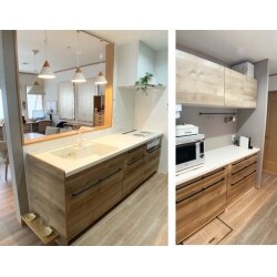 キッチン設備は、お客様が事前にショールームを見て頂いた商品で決定しました。 明るい木目調のキッチンにアイアンブラックの取っ手をつけました。床はキッチンのお色に合わせて、暗すぎず明るすぎずの程よい色合いのカームチェリー柄です。 以前は、床下収納が使えないなどの不便もありましたが、カップボードの一部をワゴンタイプの収納にすることで、解消することが出来ました。全体的にまとまりのある素敵なキッチン空間に仕上がりました!