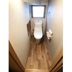当初は予定にありませんでしたが、ご一緒にトイレもリフォームさせていただきました。 設備は、LIXILのアメージュZAで、トイレ床は木目調のクッションフロアです。またアクセントクロスも、キッチンと同じ色にすることで、統一感のある空間になりました。