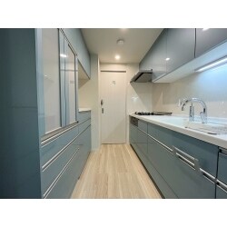 マンションの躯体やパイプスペースに配慮し独立型キッチンをご提案させていただきました。 収納部分もしっかりと中に何を収納したいのか伺って棚を設置しました。