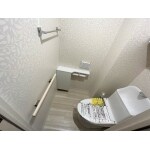TOTOの一体型便器 タンク手洗ありです。壁紙は奥様のこだわりです。大人っぽくエレガントな印象になりました。
