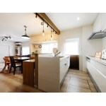シンクとコンロが分離したタイプの二の字型で対面キッチンをご提案。 梁から伸びる照明がまるでバーカウンターの様なおしゃれなキッチンに。