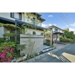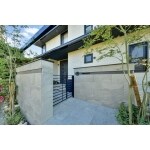 ある程度まわりの植栽や石垣を残しながら、門壁は石調のタイルを使い重厚感を、床と階段はボルケーノ平板を張り出し浮遊感を出し、フレーム・門扉は建物ブラックで、全体的にシックモダンなモノトーン外構でまとめてみました。 ダウンライトやスポットライトで夜の外構もしっかりと演出します。