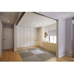 ダイケンの縁なし畳(銀鼠色)を使ったモダン和室は、フローリングとの相性も抜群。 建具は上吊り式の引き戸を使用しており、床にレールがなくお掃除の手間を軽減。周囲の洋室にも馴染む自然なゾーニングが叶いました。 普段は引き戸を開け放して寝室を開放的に使用することも可能です。 寝室に調和する、モダンでお洒落な和室が完成しました。