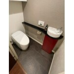 マンションにお住まいのC様。 もともとタンクレストイレをお使いでしたが、長年お使いで古くなってきたので、新しい最新のタンクレストイレへのリフォームをご検討されていました。 赤の差し色がステキな手洗器はとてもキレイな状態でしたので、既存利用しました。