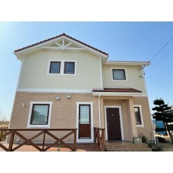 軒天の木は白色にし変更し全体をクリーム色にしました。白色の縁取りがとても素敵です。 そして、汚れが付きにくい塗料なので長い期間美しい美観を保てます。