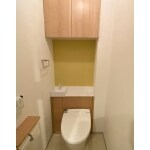 収納棚を取り付けてモノを少なくしたお洒落なトイレ
