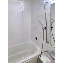 LIXILリノビオVの、色合いは全体的に白ベースをご提案。 アクセントパネルに組石ホワイト、周辺パネルは鏡面ホワイト、床・浴槽共にもホワイト。 照明の色も元々は赤味のある電球色だったのですが、青白い昼白色に変更。 工事も1日で完了し、透き通るような純白が映える明るい仕上がりに大満足していただけました。