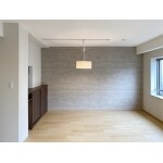 フローリングはハードメイプル色(床暖房温水マット敷込)。石目調のアクセントクロスと温かみのある照明がリビングの雰囲気を演出します。 キッチンカウンター上部の埋設型のエアコンを撤去。カウンター下には収納棚を作りました。 スマホなど日常のちょっとしたものを充電できます。 乱雑に見えがちなケーブル類の専用置場になります。