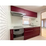 LIXILアレスタ W2400 にお取替え。 扉カラーはソリッドレッド。白い壁にキリッとシックな赤です。ピンクの床がよく合います。ガス加熱機器からIHに変更しました。 壁にはアクセントでタイル調のクロスを施工しました。