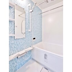 取り外しのできる収納棚ですっきり!モザイクアクアが爽やかな、ホッと落ち着けるあたたか浴室に。