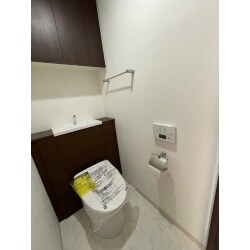 手洗い付きタンク・袖リモコン付き洗浄便座の為、壁の給水菅の露出・コンセントの配線類など清掃が大変であった