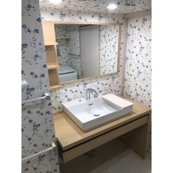 お施主様のご要望を第一に考えて、 ルミシスのベッセルタイプにエスタの木枠付き一面鏡プラスミドルキャビネットをご提案いたしました。 水栓はタッチレス水栓をご提案。 マンションで設置面の壁が躯体だったため、電気の配線をどうするかが悩みどころでしたが、 何とか配線を目立たない形で仕上げるご提案が出来ました。 『他社には無かった提案!!』と、お客様に大変喜んで頂けました。
