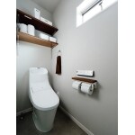 高所に設置した横長の窓から明かりが入りとても明るい空間に。最新のトイレでお掃除がラクラクに。