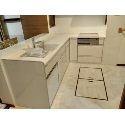 形は似たようなL字のキッチンで、ガスからIHに変更しました。真っ白なキッチンが輝いてとても素敵です。 収納もたくさんあり使い勝手もいいです。