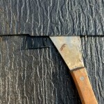 シミが流れるように劣化しているのがわかります。またスレートの下側が劣化していることからも雨水の流れと溜まりが劣化の要因だということがわかります。